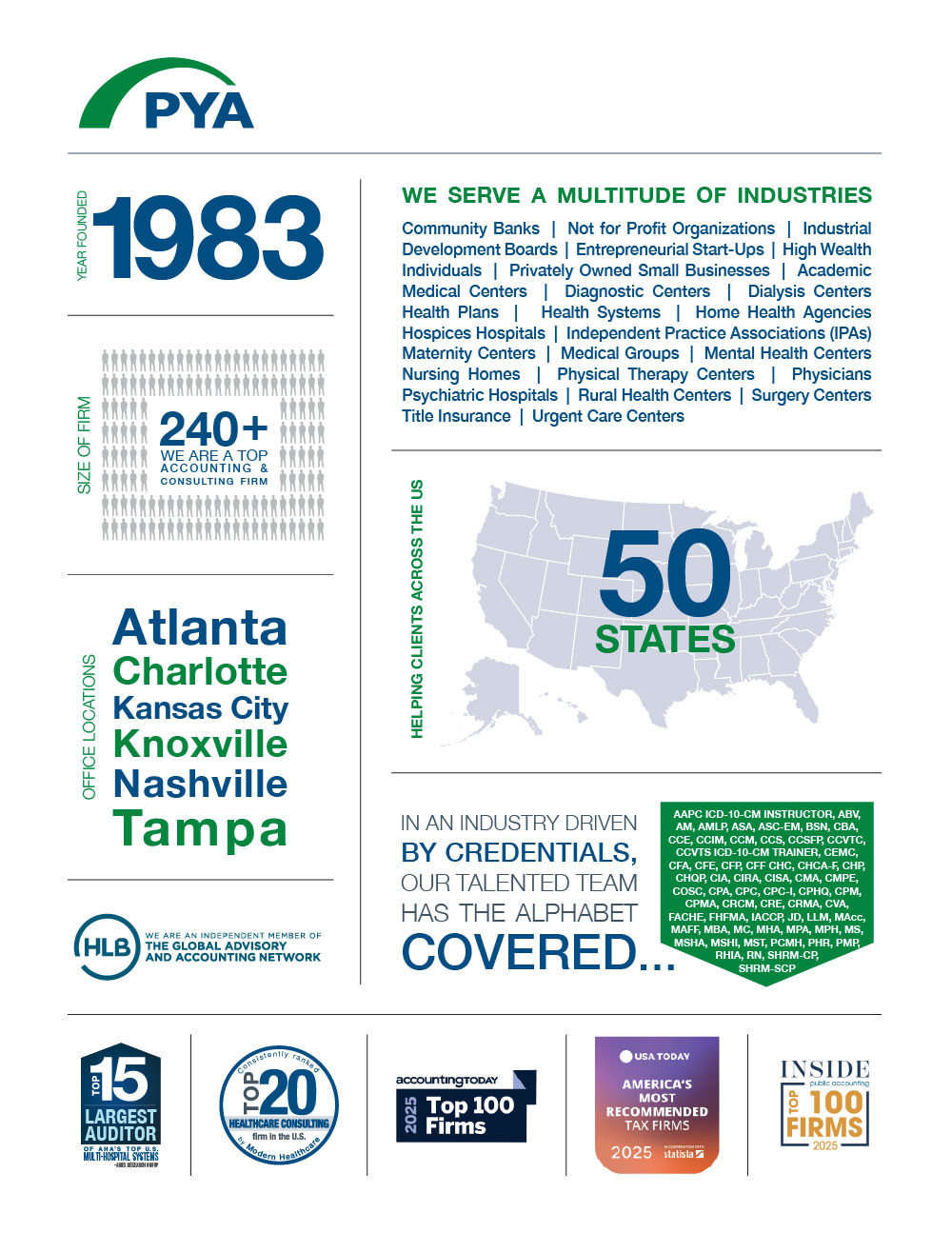 PYA is recognized as one of the nation’s Top 100 CPA firms, and as a Top 20 healthcare consulting firm. We got here by earning our clients’ trust. They expect us to be there, helping develop strategies for running successful businesses amid growing regulation and risk.